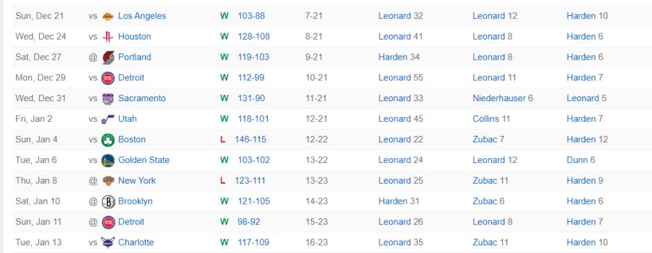 全场比赛小卡仅仅打31分钟,19中11,三分9中5,拿到35分5篮板3助攻1失误,命中率57.9%,三分命中率55.5%,真实命中率76.2%,正负值+8。过去的12场比赛小卡正负值+96快船第一。