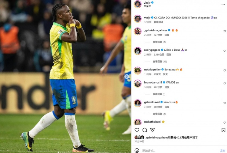 1北京时间6月11日,巴西国家队在世预赛南美区关键战中1-0力克巴拉圭,皇马球星维尼修斯攻入全场唯一进球。赛后,这位23岁的锋线杀手在社交媒体晒出激情庆祝照,并配文:"2026年世界杯,我们来了!" ...