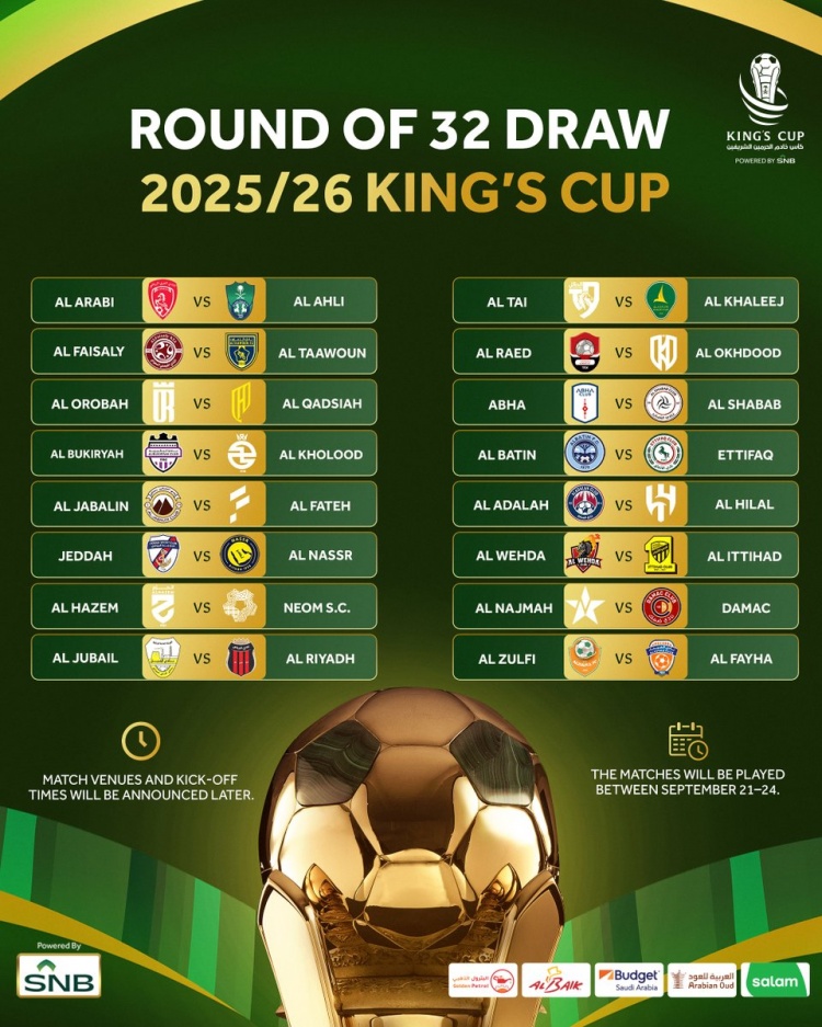 16月3日讯 2025-26赛季沙特国王杯32强抽签结果正式出炉,多场焦点对决引人关注。卫冕冠军利雅得新月将迎战哈萨正义,而同城死敌利雅得胜利则对阵次级联赛球队里比亚。比赛将于9月21日至24日期间进行...